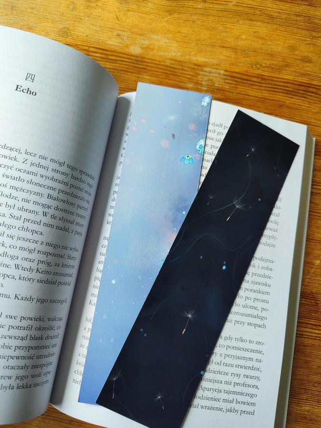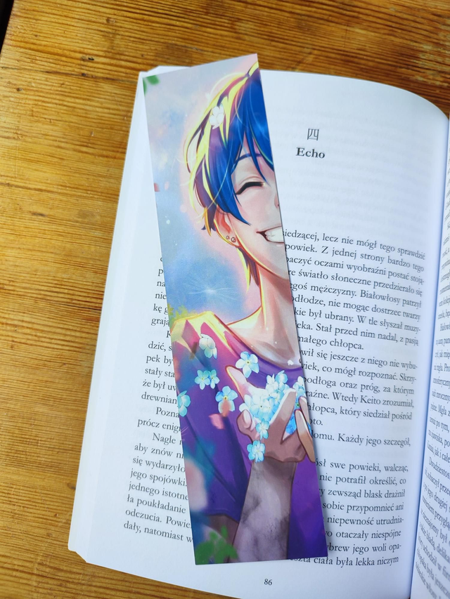 Dwustronna zakładka papierowa przedstawiająca głównego bohatera Sotę.